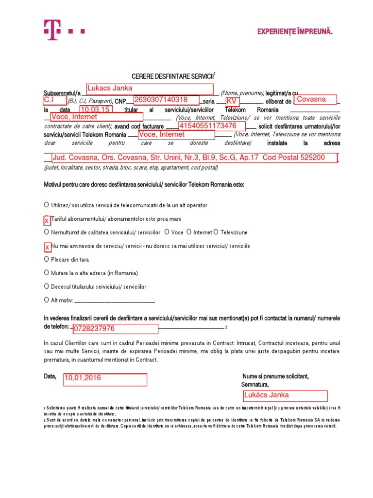 Cerere Desfiintare Servicii Persoana Fizica Telekom Romania