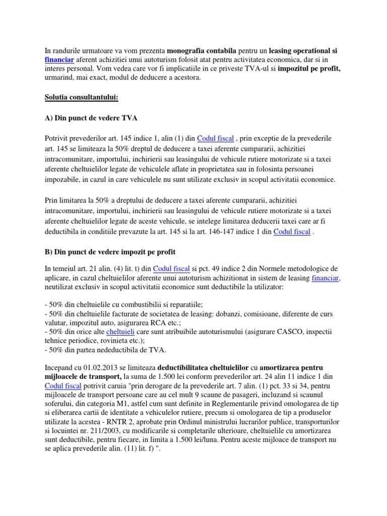 Monografie Contabila Pentru Leasing Financiar Incadrare Fiscala Privind Deductibilitatea Si Regimul Impozabil